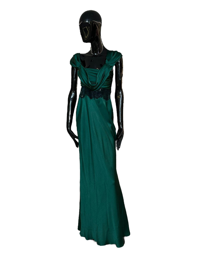 Long satin dress with lace inserts that create a delicate see-through effect. Soft drapes enhance the neckline and leave the shoulders exposed, for a very sensual effect. The fit is fluid and flowing, creating a small train.