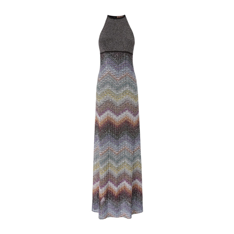 Un abito da donna lungo senza maniche che unisce eleganza e movimento, realizzato in viscosa lamé con paillettes. Lo scollo all'americana e la gonna arricchita dal pattern zig zag, tramato a telaio Caperdoni, creano un gioco di luci e texture che valorizza la silhouette, incarnando lo stile distintivo e sofisticato di Missoni.