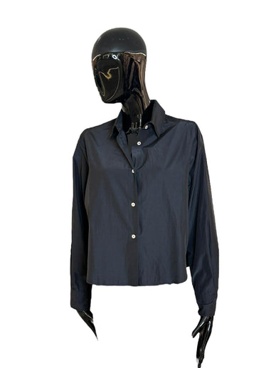 • With its light, crisp feel, taffeta interprets the new boxy shirt: cropped at the waist and loose in volume, it plays with the season's dusty shades, illuminated by laser embroidery with baguette crystal applications in floral shapes. Slightly imperfect in the ironing, it strikes the perfect balance between sensuality, glamour, and an urban touch.