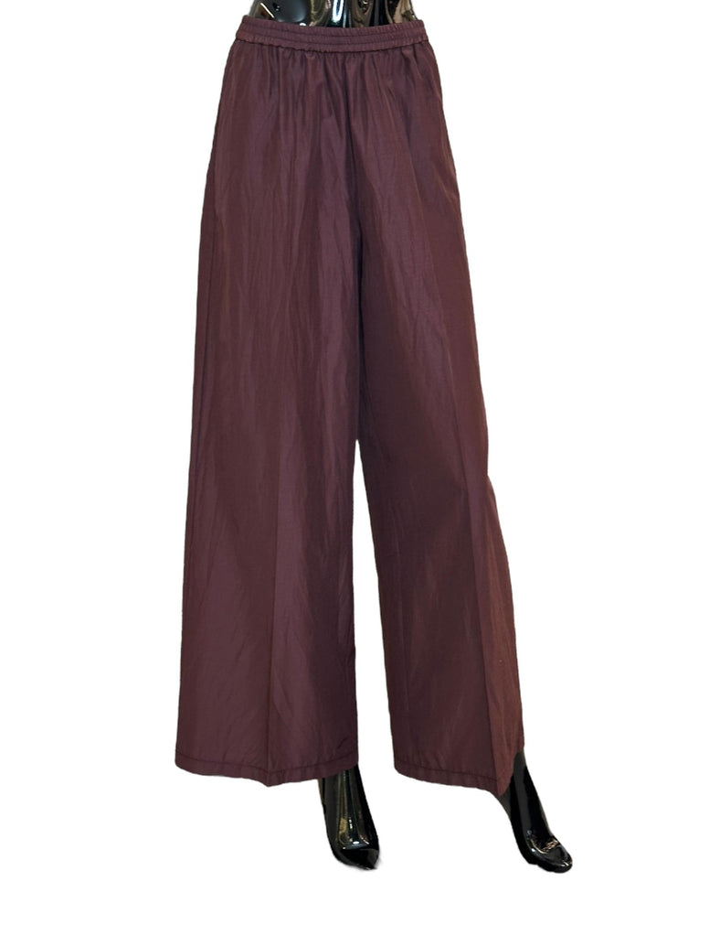• Casual, soft, and timeless, palazzo pants find a new elegance in this ruffled taffeta version from forte_forte. The delicate nuances soften the lines, making them more feminine and romantic, while the elastic waistband accentuates the relaxed feel.