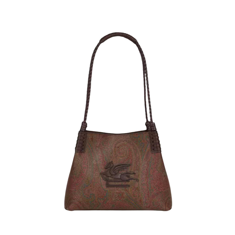 Borsa shopping Libra piccola realizzata nell'iconico tessuto Paisley jacquard e arricchita da un'applicazione in pelle con logo Pegaso ricamata sul davanti. L'accessorio presenta due ampi manici intrecciati per una portabilità a spalla e una lavorazione con infilature sugli angoli superiori. All'interno, completano il design l'anello a D in metallo dorato e la pratica pochette in suede.