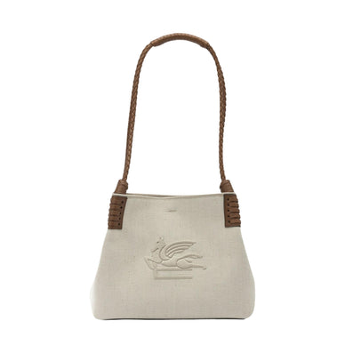 Borsa shopping Libra piccola realizzata in tela di lino misto cotone e arricchita da un'applicazione con logo Pegaso ton sur ton ricamata sul davanti. L'accessorio presenta due ampi manici intrecciati in pelle per una portabilità a spalla e una lavorazione con infilature sugli angoli superiori.