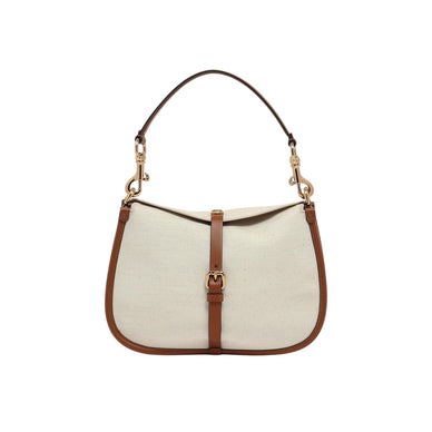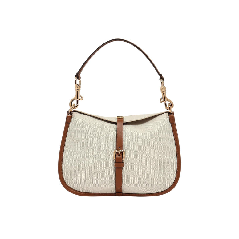 Borsa Pony dalle linee morbide realizzata in tela di lino misto cotone con dettagli in pelle e finiture ricamate. Presenta una doppia chiusura: quella principale con bottone magnetico decorato dalla moneta in metallo con Pegaso, ottenuta tramite coniatura, e quella secondaria con fibbia metallica funzionale. Il modello include manico e tracolla intercambiabili, per consentire una portabilità a mano, a spalla o crossbody, con dettaglio Paisley in corrispondenza dei moschettoni.