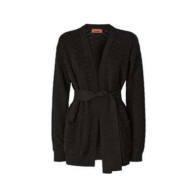 Un modello femminile e sofisticato: questo cardigan da donna in misto cotone e viscosa è animato dal motivo chevron tono su tono, icona della maglieria Missoni. La cintura in vita sottolinea la silhouette con naturale eleganza, mentre le tasche frontali aggiungono un dettaglio funzionale che completa il design con equilibrio.