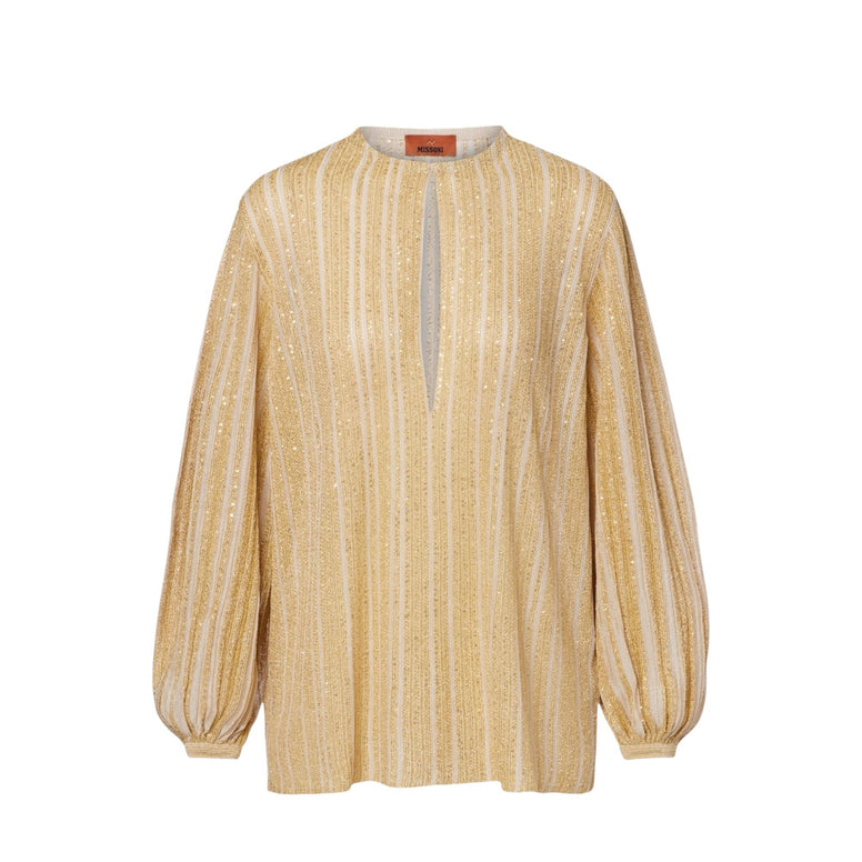 Blusa da donna realizzata in maglia di viscosa lamé a costine con applicazione di paillettes, maniche lunghe e profonda scollatura a V. Un capo che unisce luminosità e raffinatezza, espressione della maestria artigianale di Missoni.